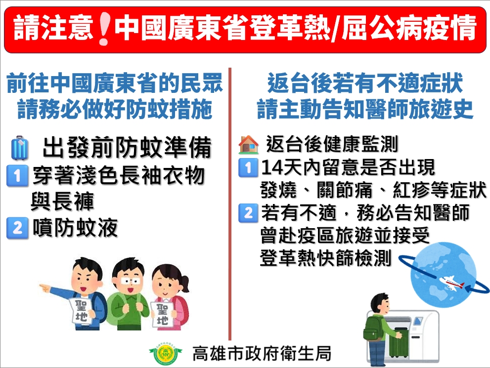 與登革熱不同的是,部分感染屈公病的病人會持續數週的倦怠感,有些患者的關節會痛到無法行動,並持續數週至數月,甚至數年,此與登革熱表現不同,典型的登革熱不會出現長期的關節痛,為屈公病特徵。 疾管署也提醒,計劃前往屈公病流行地區的民眾,應落實防蚊措施,穿著淺色長袖衣褲,使用政府機關核可,含敵避(DEET)、派卡瑞丁(Picaridin)或伊默克(IR3535)成分的防蚊液。 疾管署已於國際港埠加強屈公病防範宣導及發燒篩檢,並針對入境有症狀或蟲媒傳染病流行地區旅客,執行TOCC(旅遊史、職業史、接觸史、群聚史)評估、採檢、衛教及提供防蚊液等檢疫措施;如發現疑似個案,後續將由地方衛生單位持續追蹤並啟動相關防治措施。
